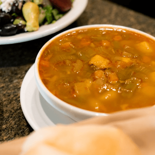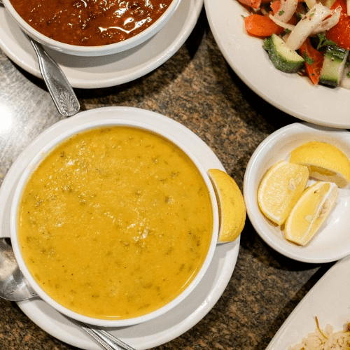 Includes two soup or salads - tabbouli, hommous, baba ghannooj, falafel, grape leaves, spinach pies and mjadra