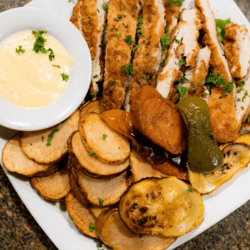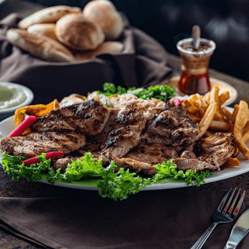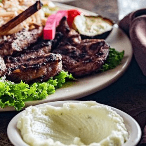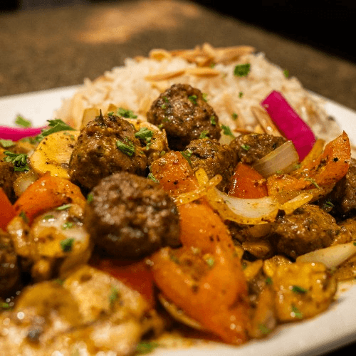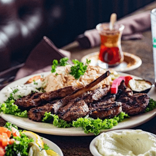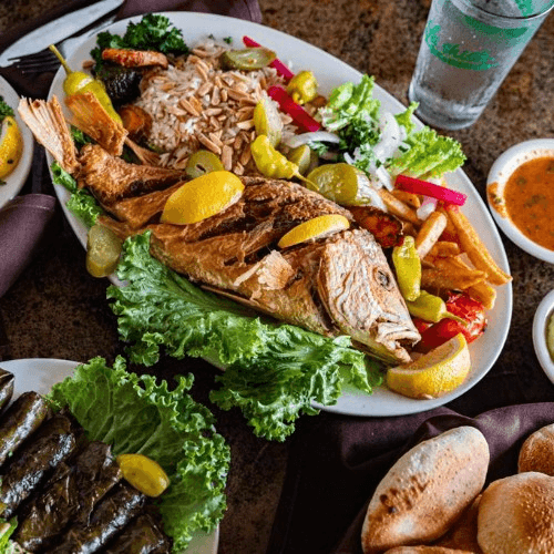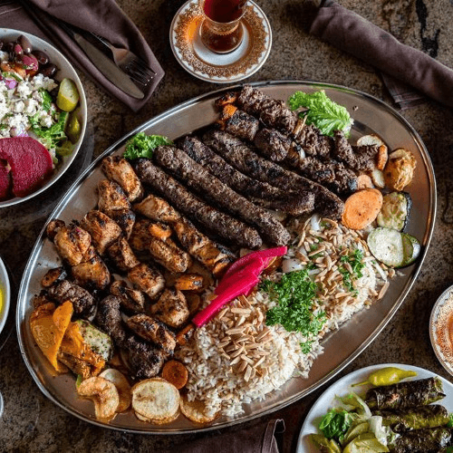 Hommous, Baba ghannooj, tabbouli, Greek salad, four falafel, three skewers shish tawook, three skewers shish kabob, three skewers shish kafta, one skewer shrimp kabob, chicken shallaba, hommous with lamb and four lamb chops. Served over rice