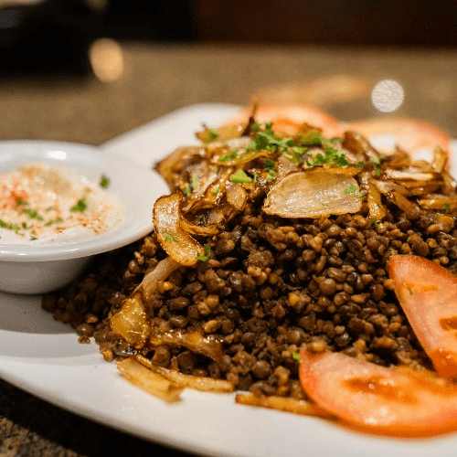 Lentils and cracked wheat cooked with onions and olive oil. Served with choice of yogurt and house salad