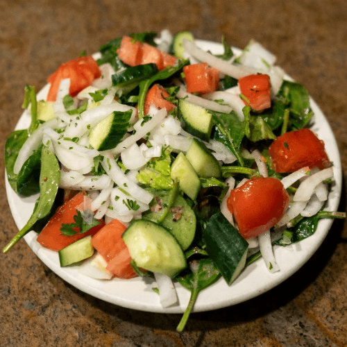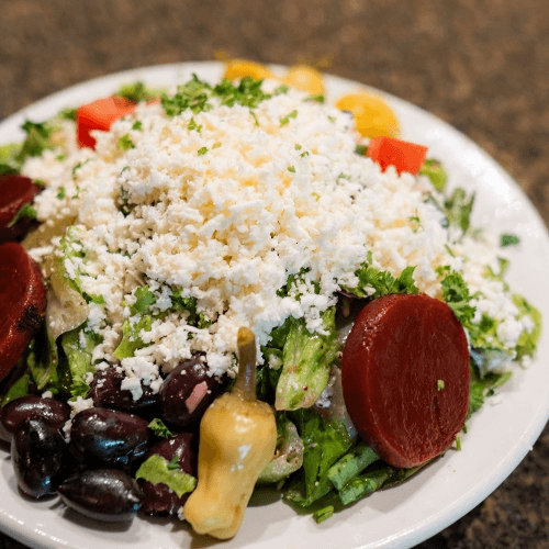 Romaine, feta cheese, beets, green olives, tomatoes, onions and cucumbers