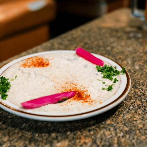 Char-grilled essplant blended with tahini sauce, lemon juice and garlic. Top it with a little extra virgin olive oil and enjoy